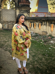 Yellow Tussar Silk Dupatta with Red and Blue Floral Design