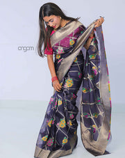 Elegant Black Organza Saree with Floral Design and Zari Border