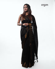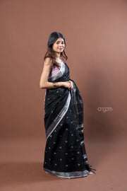 Elegant Black Linen Saree with Silver Border and Subtle Motifs