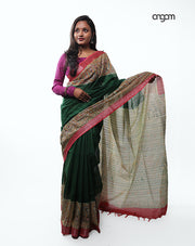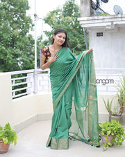 Elegant Green Liva Saree with Zari Border and Striped Pallu
