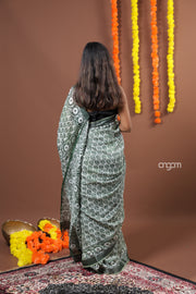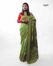 Elegant Green Kolika Hand-Painted Mercerised Cotton Saree with Artful Designs