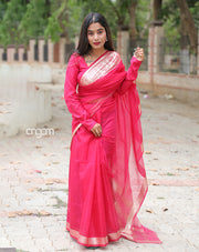 Elegant Pink Cotton Slub Saree with Intricate Patterns and Border