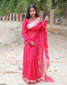 Drape yourself in elegance with this exquisite pink organza saree, featuring a delicate golden border that adds a touch of sophistication. The lightweight and sheer texture make it perfect for festive occasions, weddings, and celebrations. The rich color enhances your grace, while the soft fabric ensures all-day comfort. Pair it with statement jewelry for a stunning traditional look.