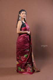 Kolika Ghicha Digital Print Saree in Maroon with Floral Elegance