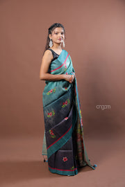 Elegant Dark Green Liva Saree with Golden Zari Motifs & Border
