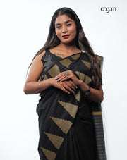 Sophisticated Black Liva Cotton Saree with Gold Temple Motifs