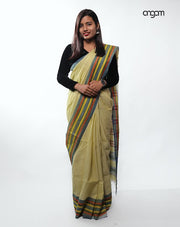 Elegant Handloom Khadi Cotton Saree with Colorful Striped Border