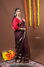 Graceful Brown Organza Saree with Rich Border and Sheer Elegance
