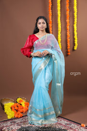 Sky Blue Organza Saree with Silver Zari Border – Ethereal Elegance