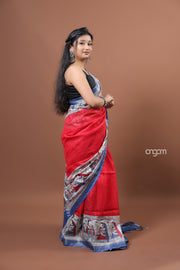 Red and Blue Cotton Slub Saree with Ethnic Printed Border