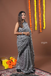 Elegant Black Cotton Slub Saree with Floral Print and Border