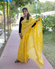 Vibrant Yellow Organza Saree with Elegant Woven Design for Celebrations