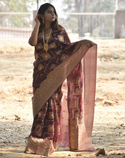 Rich Brown Organza Saree with Intricate Golden Zari Work Border