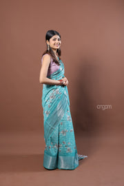 Teal Blue Kota Viscose Digital Print Saree with Floral Design